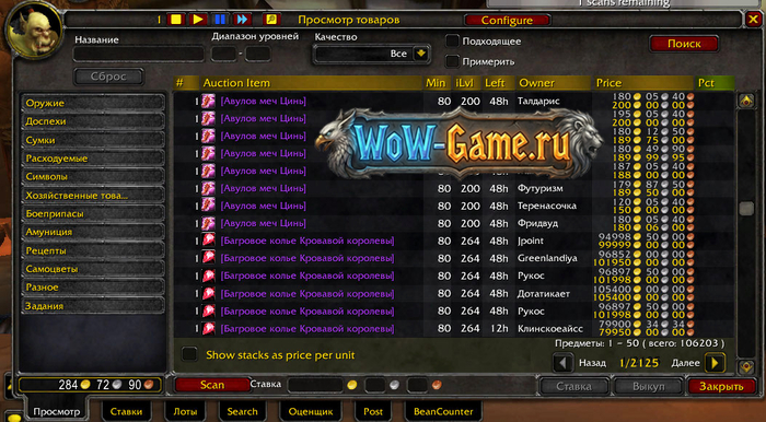- Auc-Stat-Purchased - Модуль статистики, который пытается определить цены покупки на основе лотов, которые исчезают до истечения срока их действия. (Требуется более частое сканирование аукциона)