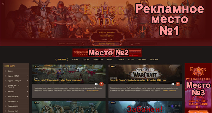 Вы хотите разместить ваш рекламный баннер на нашем игровом сайте по World Of Warcraft? У вас есть коммерческое предложение? Мы с интересом Вас выслушаем. Напишите нам через форму обратной связи. Желательно оставлять Skype, Telegram или другие контактные данные.