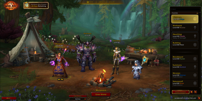 Спустя почти два десятилетия экран выбора игрового персонажа был полностью переосмыслен. Теперь же при входе в игру пользователь попадает на новую сцену кемпинга, где четверо персонажей располагаются у костра. Остальные герои остаются в списке справа, как это было прежде. В этом списке теперь отображаются абсолютно все персонажи текущей учетной записи WoW, вне зависимости от внутриигрового мира.