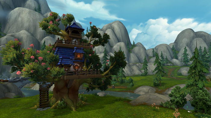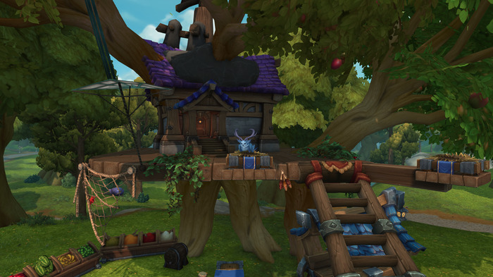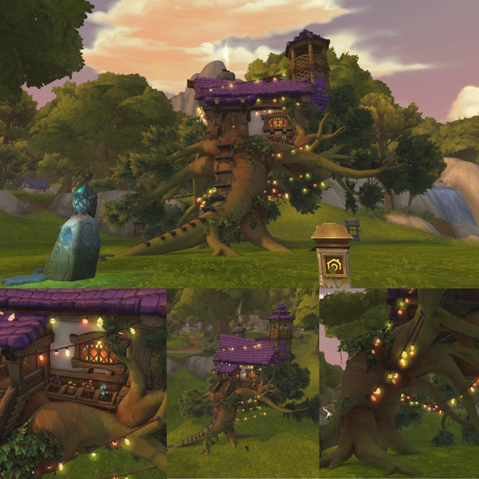 Затем у нас есть ещё один дом друида, но этот гораздо более праздничный и традиционный, но, разумеется, всё так же на дереве. Судя по огонькам, это, скорее всего, дом лунного совуха.