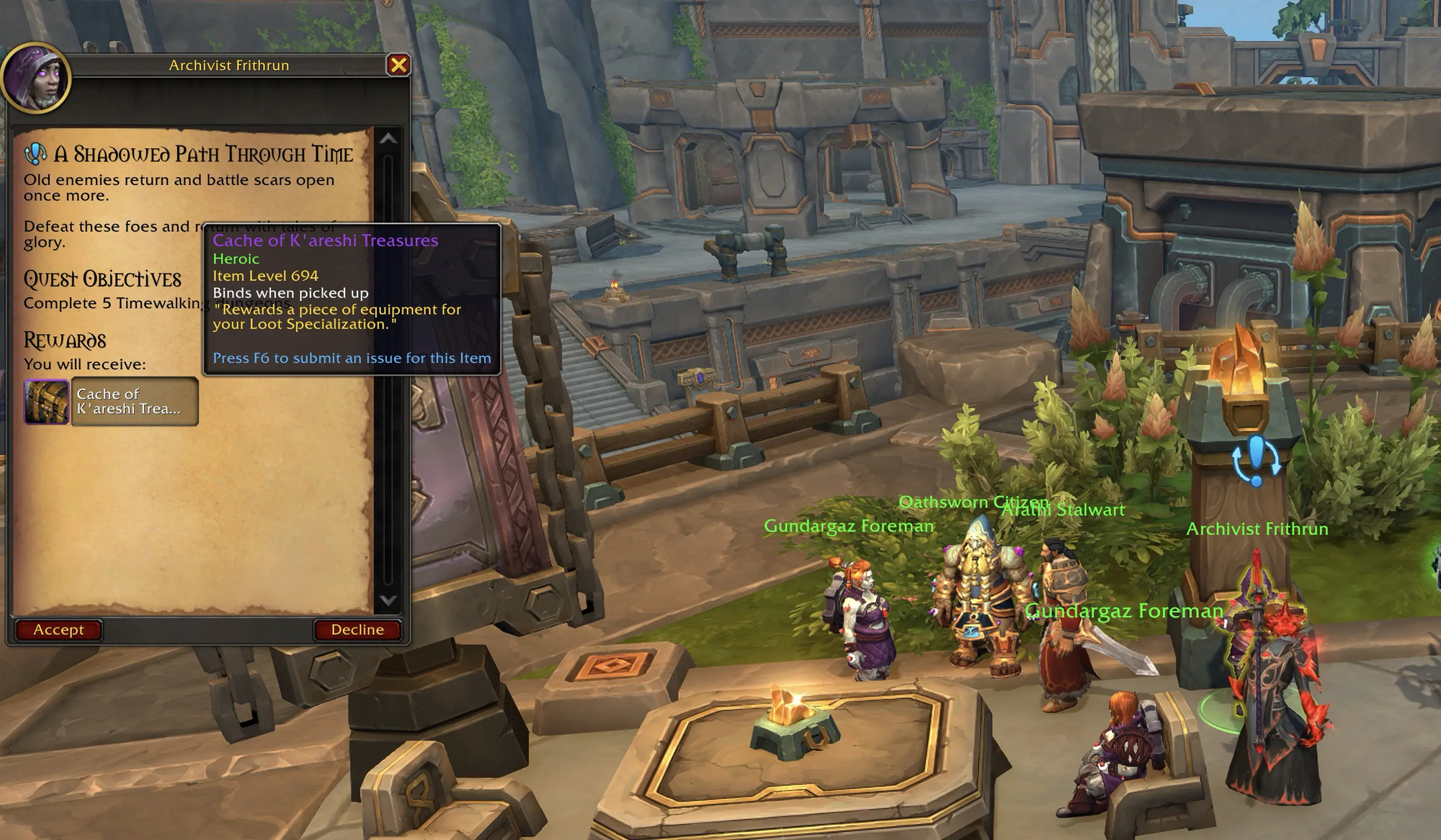 Еженедельное задание обычно даёт Сундук с сокровищами к'ареши обычной сложности, но во время события Бурные потоки времени сундук содержит экипировку уровня героической сложности, что идеально подходит для прокачки ваших альтов!