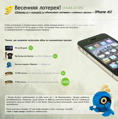 В течение двух последних недель в магазинах Эльфа-Торговца проходил набор участников в лотерею с главным призом — iPhone 4S. Сегодня, как и было обещано, будут подводиться итоги. Перед вами стрим из игры, где с помощью команды /roll среди обладателей лотерейных билетов будет разыгран iPhone 4S и еще 21 приз. Все желающие посмотреть за розыгрышем лично могут прямо сейчас встретиться на сервере Азурегос в городке Долнаар, рядом со стартовой локацией ночных эльфов.